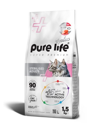 Purelife Plus Saumon Neuter. Chat 1.5 kg contribue au bon développement de votre compagnon grâce à ses ingrédients naturels et sa formle équilibrée. Développé pour répondre à tous les besoins nutritionnels des chats adultes, cet aliment est enrichi en saumon. Spécialement conçu pour les chats stérilisés, il protège le système digestif, renforce le système immunitaire et contribue à la vitalité du pelage. Grâce à sa teneur en protéines (32 %) et en matières grasses (15 %), il assure le développement musculaire et l’équilibre énergétique. The last emballage is 1.5 kg offre un usage économique et pratique. Ce produit est une alternative alimentaire de haute qualité,